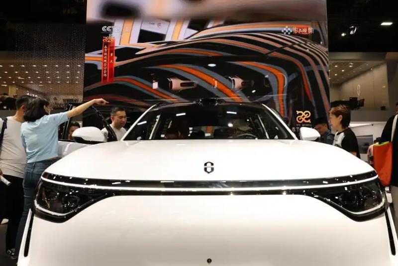 5月1日,参观者在第二十一届上海国际汽车工业展览会上的一辆问界M8展车旁交流。新华社记者 方喆 摄